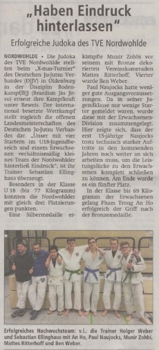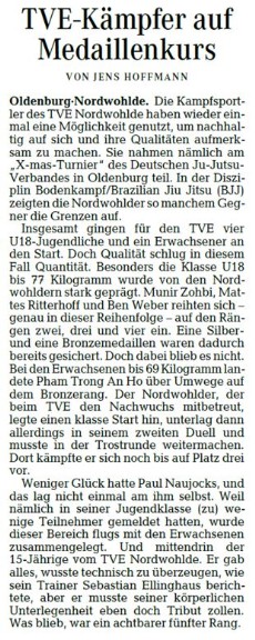 Oldenburg/Nordwohlde. Die seit einigen Jahren in der Kampfsportszene für Aufmerksamkeit sorgenden Judoka des TVE Nordwohlde konnten beim „X-mas Turnier“ des Deutschen Ju-Jutsu Verbandes (DJJV), welches am vergangenen Wochenende unter der Schirmherrschaft des niedersächsischen Innenministers Boris Pistorius in Oldenburg stattfand, in der Disziplin Bodenkampf/BJJ (Brazilian Jiu Jitsu) erneut ihre Kampfkraft unter Beweis stellen. Der international besetzte Wettkampf fand zum 19. Mal statt und stellt traditionsgemäß zugleich die offenen Landesmeisterschaften des Deutschen Ju-Jutsu Verbandes dar.