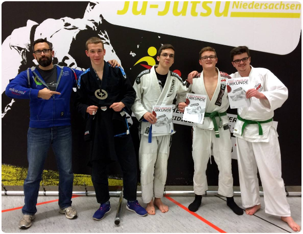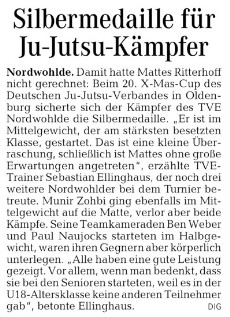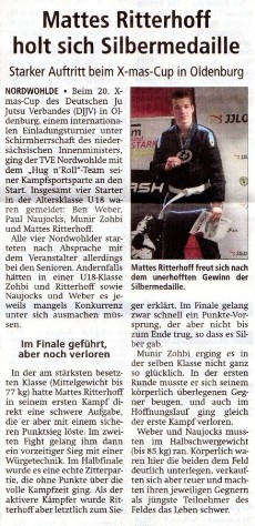 Oldenburg/Nordwohlde. Beim 20. X-mas Cup des Deutschen Ju Jutsu Verbandes (DJJV) in Oldenburg, einem internationalen Einladungsturnier unter Schirmherrschaft des niedersächsischen Innenministers, welches auch als offene Landesmeisterschaft Niedersachsen des DJJV gewertet wird, ging der TVE Nordwohlde mit dem "Hug n´Roll"-Team der Kampfsportsparte an den Start. Insgesamt 4 Starter in der Altersklasse U 18 waren gemeldet: Mattes Ritterhoff, Munir Zohbi, Ben Weber und Paul Naujocks.