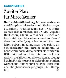 Oldenburg/Nordwohlde. Zum 23. X-mas Cup des Deutschen Ju Jutsu - Verbandes (DJJV) am 14.12. in Oldenburg reiste das durch Verletzungen dezimierte „Hug & Roll“-Team des TVE leider nur mit zwei verbliebenen gesunden Kämpfern an. Während der Coach und Spartenleiter, Sebastian Ellinghaus, selbst als Schiedsrichter ran musste, verletzte sich gleich in seinem zweiten Kampf auch einer der beiden verbliebenen Nordwohlder, so dass letztlich nur noch Mirco Zenker als Starter im U18- Juniorenbereich nach einer Medaille greifen konnte. Dies gelang ihm allerdings mit dem Gewinn einer Silbermedaille ausserordentlich gut. Lediglich im Finale musste er sich seinem starken Gegner aus Delmenhorst beugen.
