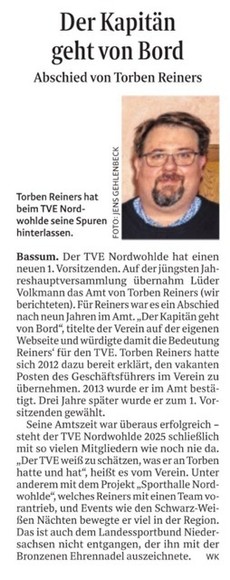 Nordwohlde. Überraschend kam es nicht. Bereits vor zwei Jahren hat Torben Reiners seine Vorstandskollegen darüber informiert, dass er auf der Jahreshauptversammlung 2025 nicht erneut für das Amt des 1. Vorsitzenden kandidieren wird. Nach Jahrzehnten ehrenamtlicher Tätigkeit "möchte er seine Freizeit vielleicht einmal anders gestalten.". Auf der Jahreshauptversammlung am 22. Januar wurde er deshalb von Lüder Volkmann abgelöst.