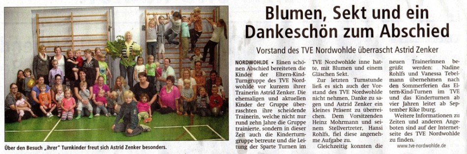 …bereiteten die Kinder der Eltern-Kind-Turngruppe des TVE Nordwohlde am Donnerstag ihrer Trainerin Astrid Zenker. Die ehemaligen und aktuellen Kinder der Gruppe überraschten ihre scheidende Trainerin, welche nicht nur rund zehn Jahre die Gruppe trainierte, sondern in dieser Zeit auch die Kinderturngruppe betreute und die Leitung der Sparte Turnen im TVE Nordwohlde inne hatte, mit Blumen und einem Gläschen Sekt.