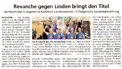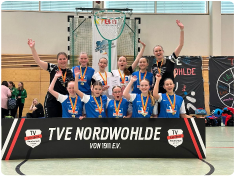 Hannover. In der Altersklasse 12/13 kämpfte sich die Korbball D-Jugend des TVE Nordwohlde nach holprigem Start gegen Victoria Linden (6:8) schließlich doch noch ins Finale. Dort gelang die Revanche gegen Victoria Linden mit 7:5 und die Landesmeisterschaft war perfekt! Für die meisten Mädels war es die allererste Landesmeisterschaft.