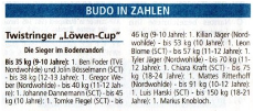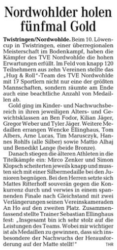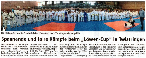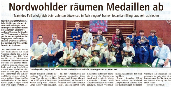 Twistringen/Nordwohlde. Am Samstag, den 21. April, trafen sich 116 Kämpfer aus knapp einem Dutzend Vereinen beim Löwencup des SC Twistringen. Unter der Anfeuerung der Zuschauer gab es in der Halle am Mühlenacker ab 11:00 Uhr faire und spannende Kämpfe. Gegen 16U00 Uhr endete die auch in diesem Jahr wieder rundum gelungene Veranstaltung ohne Verletzungen aller Beteiligten.