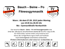 Nordwohlde. Nach den Sommerferien starten beim TVE Nordwohlde zwei neue Kurse. Ab dem 07.09.2015 jeweils von 19:45 bis 20:45 Uhr findet jeden Montag in der Gymnastikhalle in Nordwohlde der neue Kurs Fitnessgymnastik statt. Unter der Anleitung einer ausgebildeten Übungsleiterin werden Bauch - Beine - Po bewegt und beansprucht. Dieser Kurs ist für Jung und Alt und die richtige Mischung aus Kraft und Ausdauer. Dabei kann jeder, ob sportlich oder nicht, mitmachen.