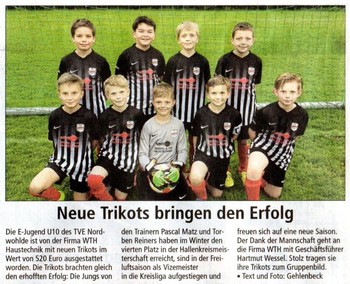 Die E-Jugend - U10 - des TVE Nordwohlde ist von der Firma WTH Haustechnik mit neuen Trikots im Wert von 520 Euro ausgestattet worden.