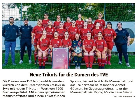 Die Frauenmannschaft der Spielgemeinschaft Barrien-Nordwohlde wurde vom Unternehmen Crash24 aus Syke mit neuen Trikots ausgerüstet. Mannschaft und Trainerteam bedanken sich beim Firmeninhaber Ahmet Göcmen.