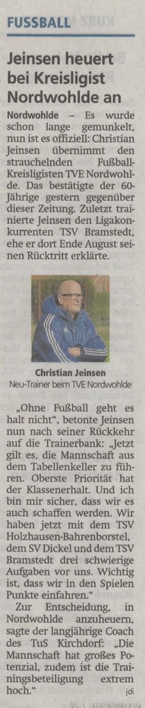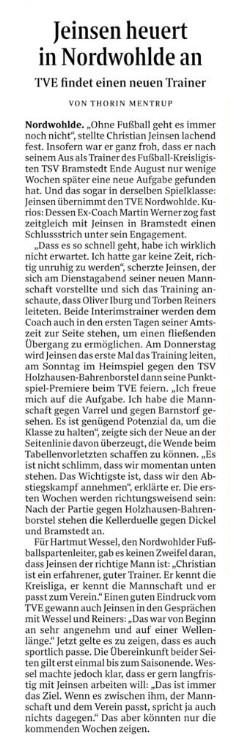 19.09.2019 Neuer Trainer für die 1. HerrenChristian Jeinsen übernimmt unsere Kreisliga-Mannschaft