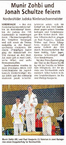 Twistringen/Nordwohlde. Bei den Niedersachsenmeisterschaften im Bodenkampf konnten die Judoka des TVE Nordwohlde am Samstag, 20.04.2013, in Twistringen ihren Überraschungserfolg des Vorjahres bestätigen und sich somit als Verein endgültig in der Kampfsportszene etablieren. Mit einem 17-köpfigen Kader ging die Mannschaft des TVE diesmal an den Start. Am Ende gab es zwei Gold-, sechs Silber- und sechs Bronzemedaillen.