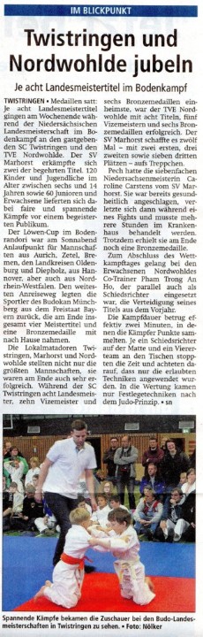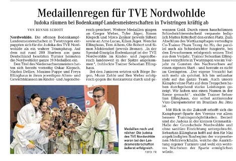 Den Titel des Niedersachsenmeisters hatten sich bereits bis zum frühen Nachmittag in ihren jeweiligen Alters- und Gewichtsklassen im Kinder- und Jugendbereich Oskar Klopsch, Marlon Dellies, Maximo Puppe und Freya Ellinghaus gesichert. Weitere Medaillen gingen an Gregor Weber, Tyler Jäger, Simon Klopsch und Mirco Zenker (jeweils Silber), sowie an Arne Lucas, Kilian Jäger, Wencke Ellinghaus, Tom Albers, Ole Bobert und Simon Middendorf (jeweils Bronze). In der Spezial-Disziplin Bodenkampf ist der TVE Nordwohlde damit im Kinder- und Jugendbereich landesweit in der Spitze angekommen.