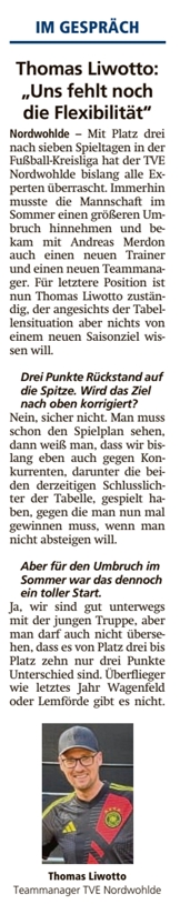 20. September 2024 Thomas Liwotto im Gespräch1. Herren TVE Nordwohlde in der Fußball-Kreisliga auf dem 3. Platz!