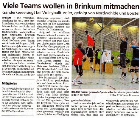 Brinkum/Nordwohlde. Beim 7. Brinkumer Volleyballturnier des FTSV Jahn Brinkum belegte das Team "DiNos" einen respektablen 2. Platz hinter "Green Inferno" (TSV Ganderkesee). Die "DiNos" sind ein gemeinschaftliches Volleyball-Mixedteam des SV Dimhausen und des TVE Nordwohlde.